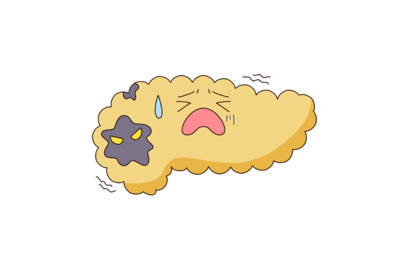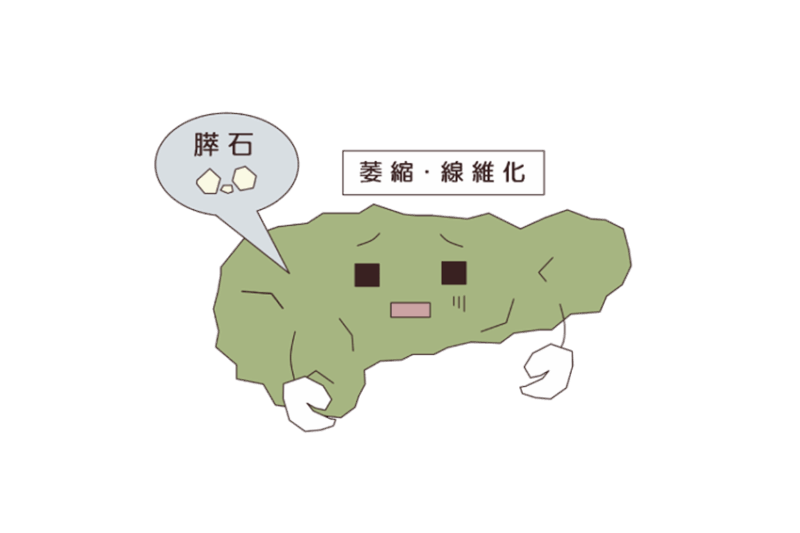 慢性膵炎は、長年の炎症によって膵臓の細胞が少しずつ破壊され、元に戻らない硬い組織(線維化)に置き換わってしまう病気です。