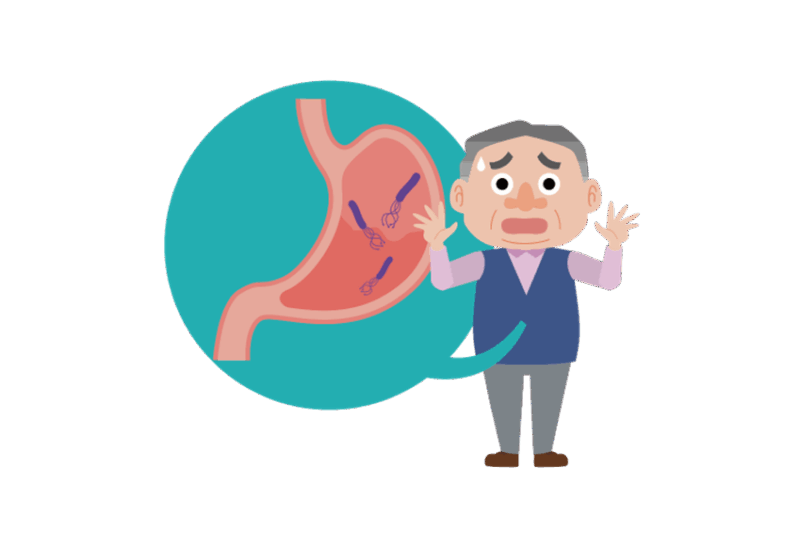 胃潰瘍・十二指腸潰瘍の最大の原因です。ピロリ菌が胃の粘膜に棲みつき、防御機能を弱めることで、胃酸の攻撃を受けやすくなり潰瘍が発生します。